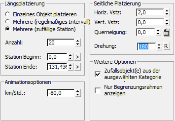 - Bereich "Längsplatzierung": Wählen Sie "Mehrere (zufällige Station)" und achten Sie darauf, dass die Anzahl auf den Vorgabewert 20 eingestellt ist.