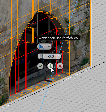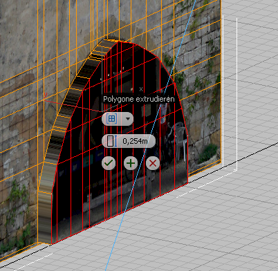 Sie werden den Bogen in zwei Schritten extrudieren: Im ersten Schritt erhält die Wand Tiefe und im zweiten Teile des Innenbereichs des Bogengangs hinter dem Bogen.