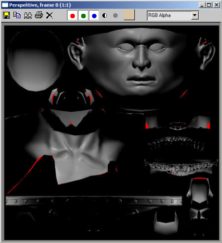Der gerenderte Frame zeigt das nicht eingeschlossene Streufarben-Map des Modells mit hoher Auflösung. Es sind zufällige rote Flecken sichtbar, die anzeigen, dass die Relief-Map-Projektionsstrahlen die darunterliegende Geometrie nicht ordnungsgemäß erfasst haben. Das liegt daran, dass der vom Projektionsmodifikator erstellte Käfig das hochauflösende Modell an diesen Stellen nicht vollständig bedeckt hat.