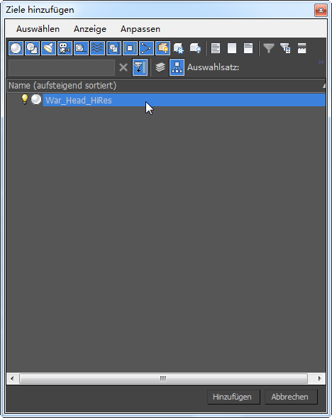 (Auswahl isolieren ein/aus), um wieder zur zusammengeführten Ansicht zurückzukehren. Um sicherzustellen, dass Sie das niedrig auflösende Modell ausgewählt haben, überprüfen Sie, ob das Rollout "Name und Farbe" War_Head_LoRes anzeigt.