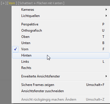 (Ansichtsfenster maximieren), um zu einem Layout mit vier Ansichtsfenstern zu wechseln. Aktivieren Sie das Ansichtsfenster "Vorn", klicken Sie auf das Richtungsansichtsfenster: Beschriftungsmenü, und wählen Sie "Zurück". Drücken Sie dann erneut Alt+W.