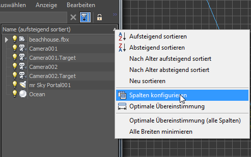 - Auf dem Szenen-Explorer klicken Sie mit der rechten Maustaste auf die Spaltenüberschrift, und wählen Sie aus dem Dropdown-Menü die Option "Spalten konfigurieren".