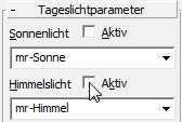 - Deaktivieren Sie im Rollout "Tageslichtparameter" die beiden Aktiv-Schaltflächen für das Sonnenlicht und Himmelslicht.
