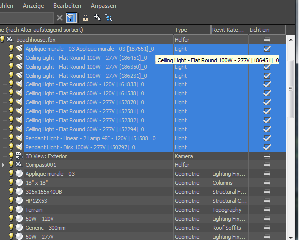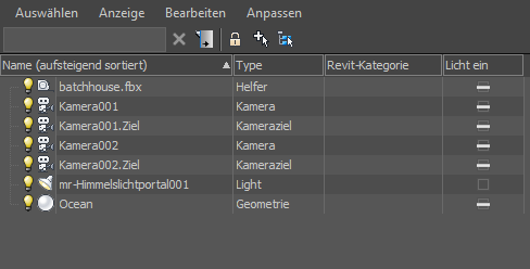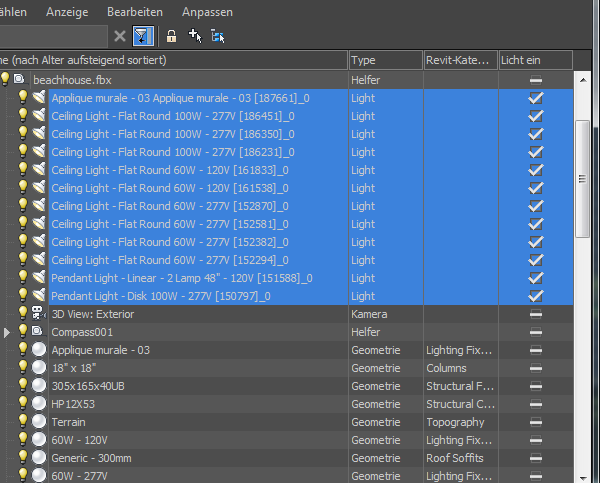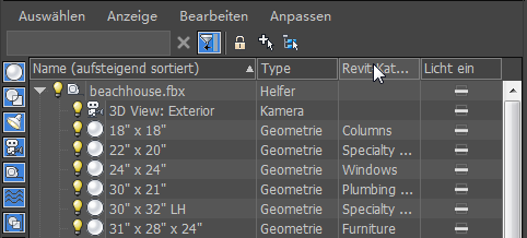 Alle Objekte, die aus der Revit-Szenendatei importiert wurden, werden jetzt nach der Kategorie geordnet.