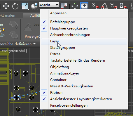 - Klicken Sie mit der rechten Maustaste in einen leeren Bereich des Hauptwerkzeugkastens und wählen aus der Dropdown-Liste die Option "Layer".