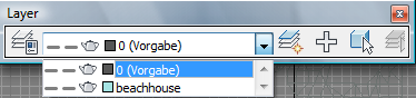 3ds Max öffnet den Werkzeugkasten Layer. Für Geometrie, die aus FBX-Dateien importiert wurde, stehen jedoch keine Layer-Informationen zur Verfügung. Derzeit enthält die Szene also nur zwei Layer: den Standardlayer (0) und den Layer Strandhaus, der die gesamte Geometrie einschließlich Lichtquellen, Kameras, Möbel, Gelände und das Gebäude selbst enthält.