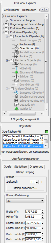 Der obere Teil des Explorers, das Civil View Explorer-Rollout, enthält einen Überblick über die Szeneumgebung, Objekte in der Szene und andere Ressourcen. Der untere Teil des Explorers ist kontextabhängig und zeigt Steuerelemente für die aktuell gewählten Objekte.