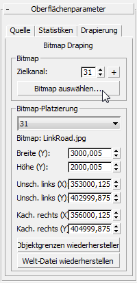 Die Registerkarte "Drapieren" verfügt über Steuerelemente zum Anwenden eines Bitmaps auf eine Oberfläche.