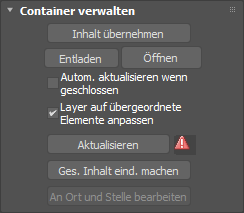 Je nachdem, ob der übernommene Container geöffnet oder geschlossen ist, zeigt die Modifikatorgruppe entweder das Rollout "Lokaler Inhalt" oder das Rollout "Übernommener Inhalt" an, niemals aber beide.