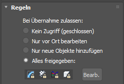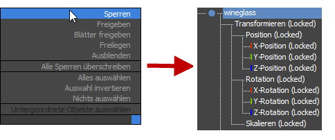 Wenn "Alles Freigegebene" aktiviert ist, können Sie Modifikatoren, Materialien, Transformationen und Objekte mit den vier Symbolschaltflächen unten im Rollout "Regeln" auf schnelle Weise sperren. Wie zuvor können Sie auch über die Schaltfläche "Bearbeiten" einzelne Spuren sperren. Der Einfachheit halber werden Sie in dieser Übung die vorhandenen gesperrten Transformationsspuren des Weinglases verwenden.