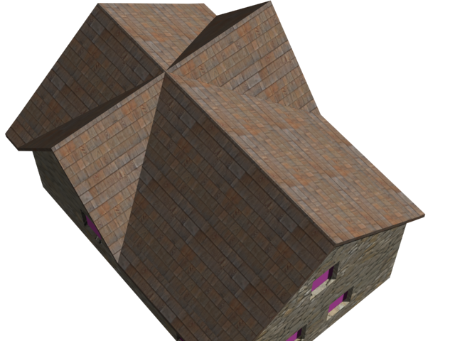Das Dach stellt andererseits ein Problem dar. Wegen seiner zwei Giebel gibt es keine direkte Möglichkeit, das Muster mithilfe von UVW-Map zuzuordnen.