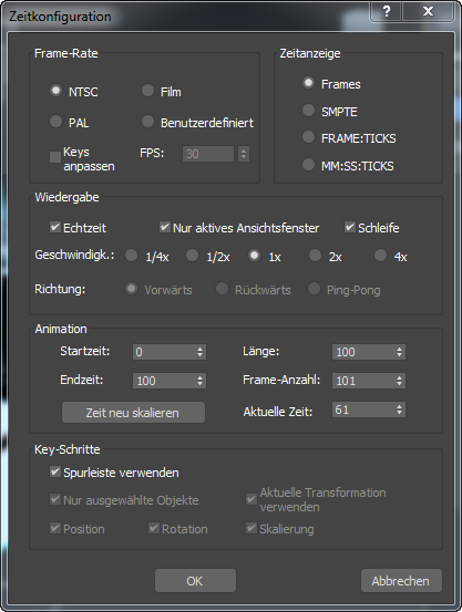 3ds Max öffnet das Dialogfeld Zeitkonfiguration.