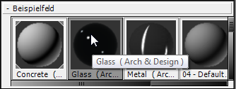 - Suchen Sie in den Musterfeldern der Material-Editor-Übersicht (links) das Material Glas, und ziehen Sie es in das Fenster Ansicht1.
