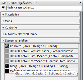 3ds Max wendet das Glasmaterial auf das Glas an. Im Bereich "Szenenmaterialien" wird jetzt der Eintrag Glas und der Name des Objekts angezeigt.