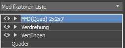 - Aktivieren Sie im Modifikatorstapel die drei Modifikatoren, die Sie zuvor deaktiviert haben: "FFD", "Verdrehen" und "Verjüngen".