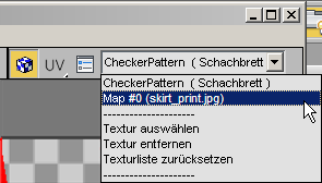 im oberen Werkzeugkasten die Dropdown-Liste "Textur", und wählen Sie Map Nr. 0 (skirt_print.jpg). (Die Map-Nummer kann variieren).