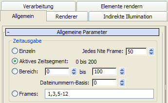Registerkarte "Allgemein" im Rollout "Allgemeine Parameter" den Bereich "Zeitausgabe". Ändern Sie die Ausgabe von "Einzeln" in "Aktives Zeitsegment", und ändern Sie anschließend den Wert für "Jedes Nte Frame" in 50.