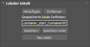 Ein Dialogfeld mit dem Titel "Containerdefinitionsdatei" wird geöffnet und zeigt den standardmäßigen Dateinamen container_start_Container001 an, der sich aus dem Szenendateinamen und dem Containernamen ableitet. Die Dateinamenserweiterung .maxc wird hinzugefügt, wenn Sie die Datei speichern.