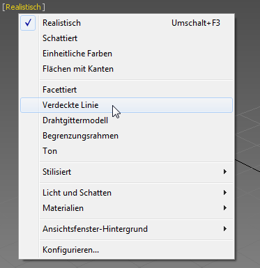 Die Option "Verdeckte Linie" ist nur verfügbar, wenn Sie den Nitrous-Ansichtsfenstertreiber arbeiten. Wenn diese Option auf Ihrem System nicht verfügbar ist, haben Sie mit dem dunklen Ansichtsfenster wahrscheinlich kein Problem. Wenn ja, drücken Sie F3, um die Ansicht im Drahtgitter-Modus anzuzeigen.