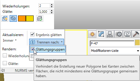 Gruppe "NURMS verwenden" die Anzahl der Wiederholungen auf 2. In der Standardeinstellung ignoriert die NURMS-Glättung die Glättungsgruppen und verschmilzt alle Flächen der P-47 miteinander.