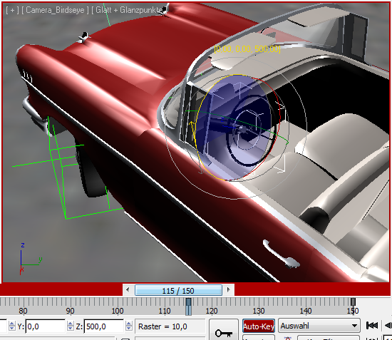- Gehen Sie zu Frame 115, der Stelle, an der sich das Auto in der Mitte der zweiten Kurve befindet, und drehen Sie das Lenkrad, bis in der Statusleiste der Z-Achse der Wert "500" angezeigt wird.
