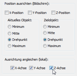 Bereich "Position ausrichten" die Optionen "X-Position", "Y-Position" und "Z-Position". Aktivieren Sie im Bereich "Ausrichtung angleichen" die Optionen "X-Achse", "Y-Achse" und "Z-Achse".