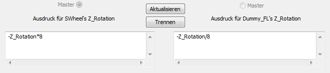 - Geben Sie im rechten Fenster unter "Ausdruck für Dummy_FL's Z_Rotation" Folgendes ein: -Z_Rotation/8.
