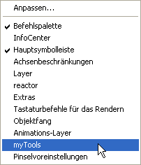 Falls der Werkzeugkasten "myTools" derzeit nicht angezeigt wird, klicken Sie mit der rechten Maustaste in einen leeren Bereich im Hauptwerkzeugkasten, und wählen Sie im Menü "myTools".