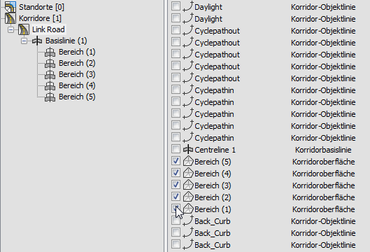 Das Fenster auf der linken Seite zeigt die Hierarchie der ursprünglichen Szene, und das Fenster auf der rechten Seite zeigt einzelne Linien- und Flächenobjekte.