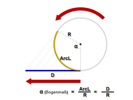 Bei einem runden Objekt wird der Drehwinkel (α) durch den Radius des Kreises und die durch den Winkel α eingeschlossene Bogenlänge definiert. Im Bogenmaß ausgedrückt ist dieser Drehwinkel (α) gleich der Bogenlänge geteilt durch den Radius des Kreises (Bogenlänge / R), wobei Folgendes gilt:
