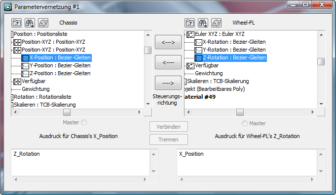 - Klicken Sie im Dialogfeld "Parametervernetzung" auf den nach rechts zeigenden Pfeil über "Richtungs-Steuerung", um sicherzustellen, dass die Y-Position von Chassis die Z-Rotation von Wheel-FL steuert.