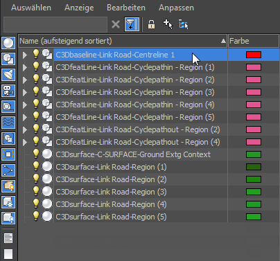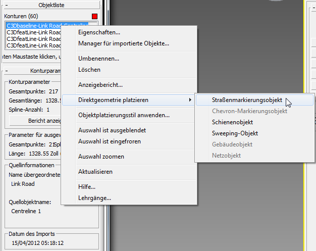 Im Civil View Explorer zeigt der untere Bereich nun ein Objektlisten-Rollout für importierte Konturobjekte. C3Dbaseline-Link Road-Centreline 1 ist markiert.