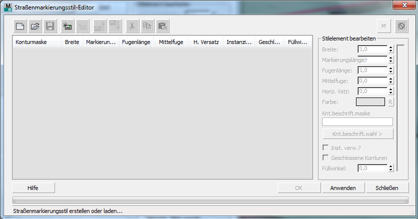 Straßenmarkierungsstil-Editor. 3ds Max öffnet das Dialogfeld Straßenmarkierungsstil-Editor.