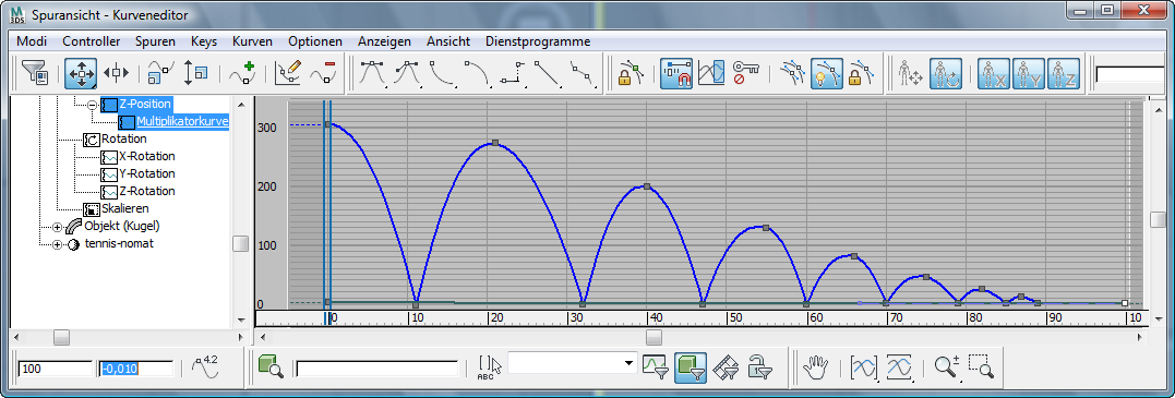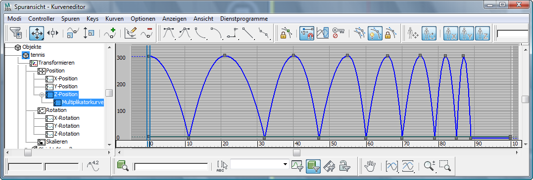 Die Multiplikatorkurve "dämpft" jetzt den Sprung des Tennisballs, um den Energieverlust während der Bewegung und beim Abprall vom Boden wiederzugeben.