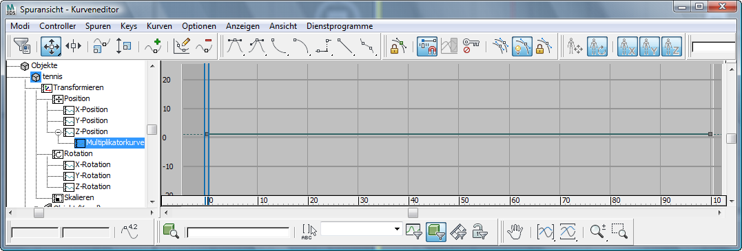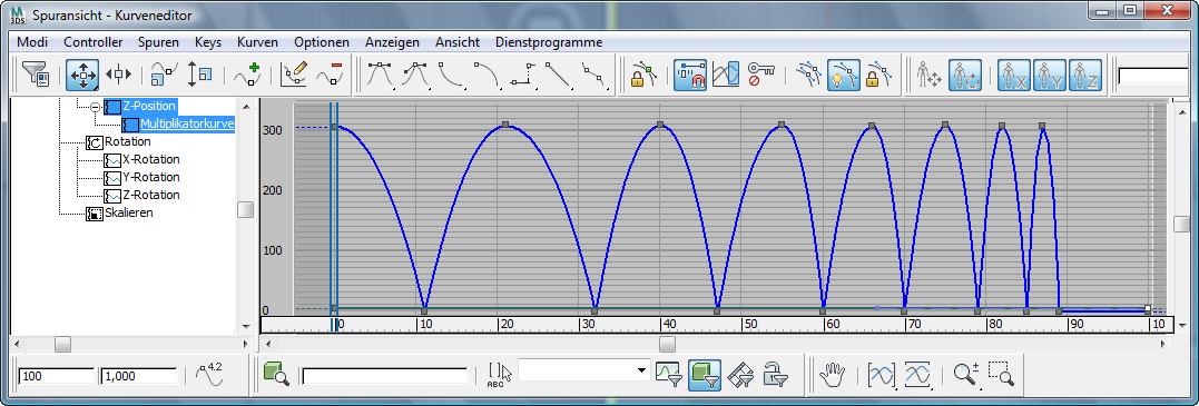 3ds Max fügt eine Multiplikatorkurve zur Z-Positionsspur hinzu. Außerdem wird die Anzeige des Kurvenfensters so angepasst, dass alle Kurven zu sehen sind.