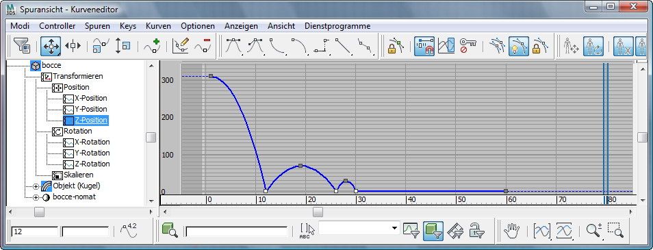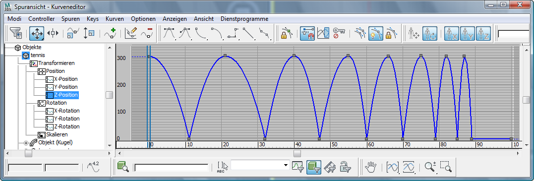 Die drei Z-Positions-Keys, wo die Kugel auf den Boden auftrifft, sind ausgewählt