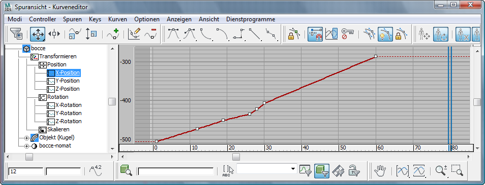Die korrigierten X-Positionskeys für die rollende Kugel