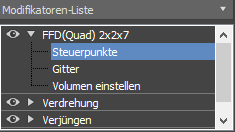 - Klicken Sie im Modifikatorstapel auf das Pfeilzeichen, um die Hierarchie des Modifikators "FFD Quader" zu erweitern. Klicken Sie auf "Steuerpunkte".