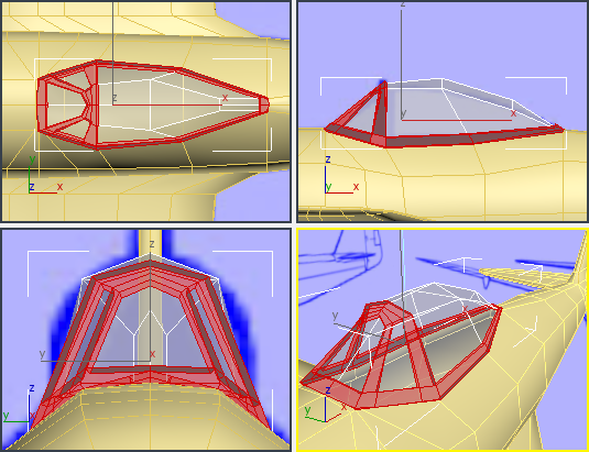 Klicken Sie an eine Stelle außerhalb der Haube, um die Auswahl aller Polygone aufzuheben. Klicken Sie bzw. klicken Sie bei gedrückter Strg-Taste auf die Polygone, die den Glaskomponenten der Haube entsprechen. Sie werden im Ansichtsfenster "Oben" arbeiten müssen, um die Polygone auszuwählen, die in der Perspektivansicht nicht sichtbar sind.