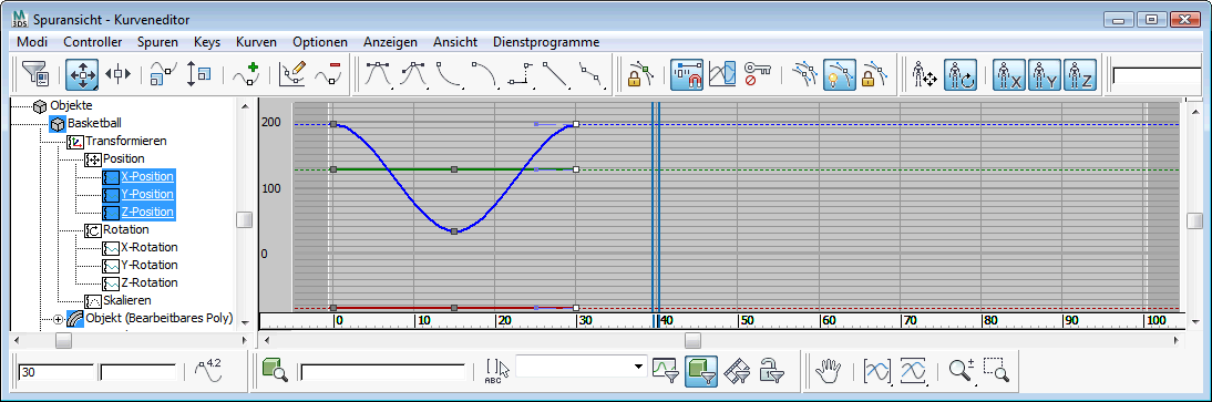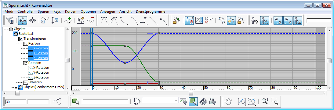 3ds Max öffnet den Kurveneditor. Die Spuren, die Sie soeben für den Ball erstellt haben, sollten links zu sehen sein und die Kurven selbst im Kurvenfenster rechts.