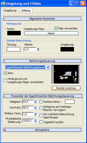 - Vergewissern Sie sich auf dem Rollout "Belichtungssteuerung", dass als Typ der Belichtungssteuerung "Logarithmische Belichtungssteuerung" festgelegt wurde.