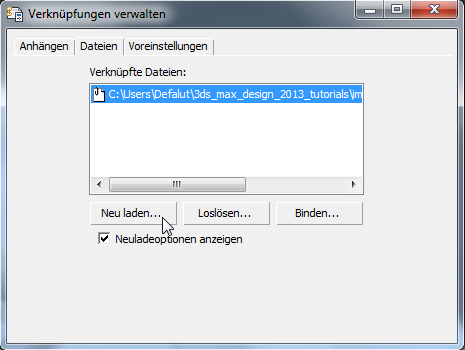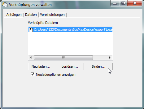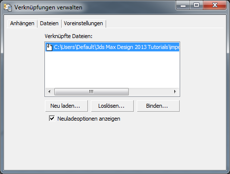 "Verknüpfungen verwalten". 3ds Max öffnet das Dialogfeld "Dateiverknüpfungs-Manager".