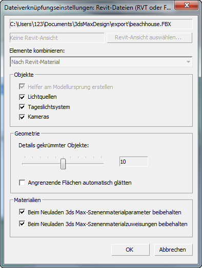 3ds Max öffnet das Dialogfeld "Dateiverknüpfungs-Einstellungen: Revit-Dateien".