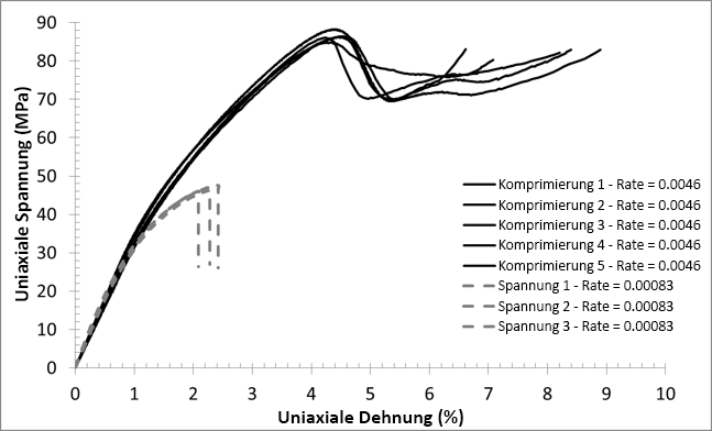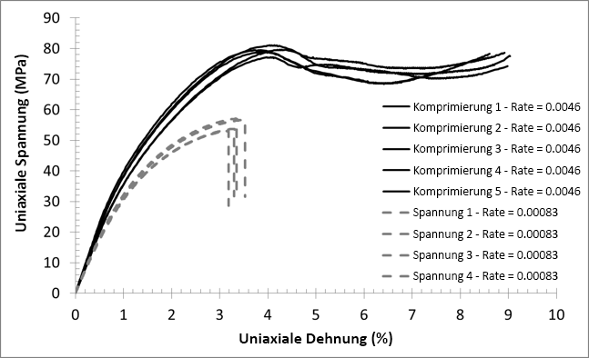 Wir sehen, dass die Zuglast zu einer höheren Geschwindigkeit der Plastizitätsentwicklung als die Drucklast führt (dies gilt auch, wenn die Reaktion auf Zug mit einer höheren Dehnungsrate erfasst wird). Dies bedeutet, dass das Material bei einer vorgegebenen Dehnungsstufe eine größere Reduzierung des tangentialen Moduls aufweist, wenn der Spannungszustand durch die Spannung dominiert wird, im Gegensatz zu einer druckdominierten Spannung.