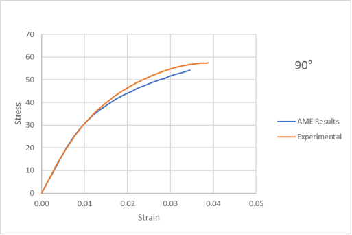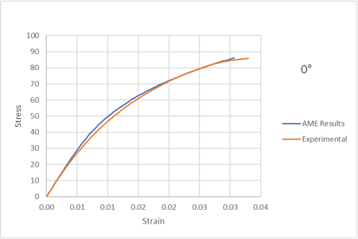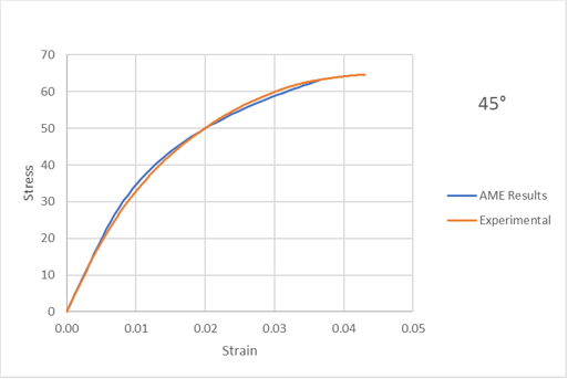 Wir können eine sehr gute Übereinstimmung zwischen den experimentellen Daten bei 0 Grad und den Ausgaben aus Advanced Material Exchange feststellen. Beachten Sie, dass Advanced Material Exchange ein spannungsbasiertes Ausfallkriterium verwendet, sodass die Tatsache, dass wir eine sehr ähnliche Bruchgrenze für jede Kurve erhalten, darauf vertrauen lässt, dass das Werkzeug zuverlässig verwendet werden kann.