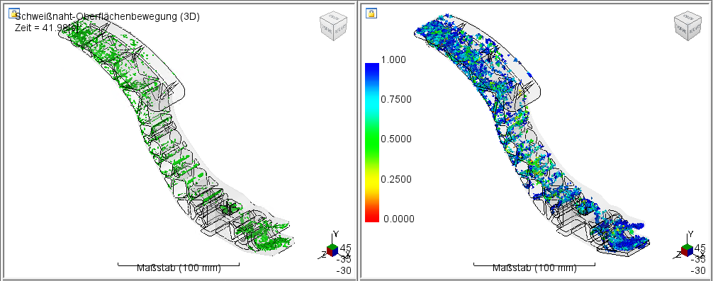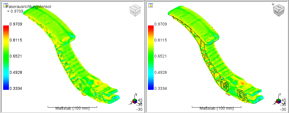 Die Konturdarstellung auf dem Strukturmodell zeigt die Festigkeitsreduktionsfaktoren, die mit Robbins-Methode berechnet wurden. Dieses Modell wurde mit guten Verarbeitungsbedingungen erstellt. Das zeigt sich daran, dass die Festigkeitsreduktionsfaktoren nahe 1.00 liegen (keine Reduktion der Festigkeit).