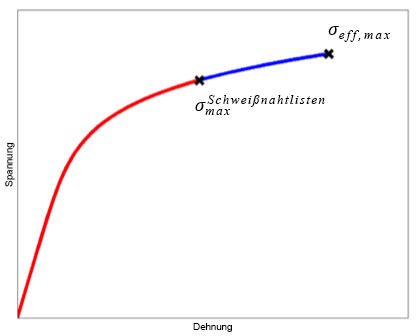 wobei η der Stärkereduktionsfaktor ist. Er muss im Bereich 0 < η ≤ 1 liegen. Diese Skalierung der maximalen effektiven Spannung bewirkt, dass das Material, das auf der Schweißnaht liegt, früher ausfällt als das gleiche Material, das sich nicht auf der Schweißnahtfläche befindet.