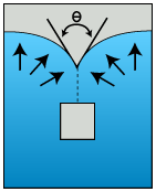 η ist der Stärkereduktionsfaktor, der an jedem Punkt auf der Oberfläche berechnet wird. Ts ist die Erstarrungstemperatur und T(t) ist die Temperatur über die Zeit hinweg wie in der WS3-Datei definiert. Die Koeffizienten cT1 und cT2 stellen die zwei Stärkekoeffizienten der Bindenähte dar, die mit der Moldflow Material-UDB-Datei verknüpft sind. θc ist der kritische Winkel (Phi Kritisch in Moldflow). θ ist der Winkel, in dem konvergierenden Fließfronten aufeinander treffen.