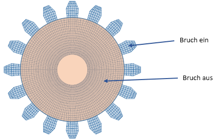 Betrachten wir ein Beispiel eines Verwendungsfalls. In diesem Beispiel möchten wir den Bruch für die Bereiche des Zahnradmodells deaktivieren, wo wir keinen Ausfall erwarten. Angenommen, die experimentellen Tests ergeben, dass der Ausfall nur bei den Zähne des Zahnrads, nicht am Zahngrund auftritt. Da wir nur Fehler an den Zähnen erwarten, können wir den Bruch für den Rest des Modells deaktivieren. Dadurch kann die Laufzeit für diese Analyse verkürzt werden.