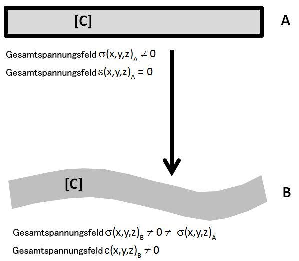 Um das zu erreichen, müssen wir die Restdehnungen oder die nicht mechanischen Dehnungen aus Konfiguration A bestimmen. Dazu füllen wir zunächst die Gleichung für das Gesammtspannungsfeld in Konfiguration A aus.